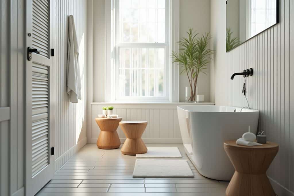 Hocker im skandinavischen Stil zeichnen sich durch helle Hölzer (oft Birke oder Esche), klare Linien und eine funktionale Ästhetik aus. Sie bringen Leichtigkeit und Gemütlichkeit in dein Badezimmer. Eine Sitzfläche aus strapazierfähigem, wasserabweisendem Stoff oder eine schlichte Holzplatte sind typisch.